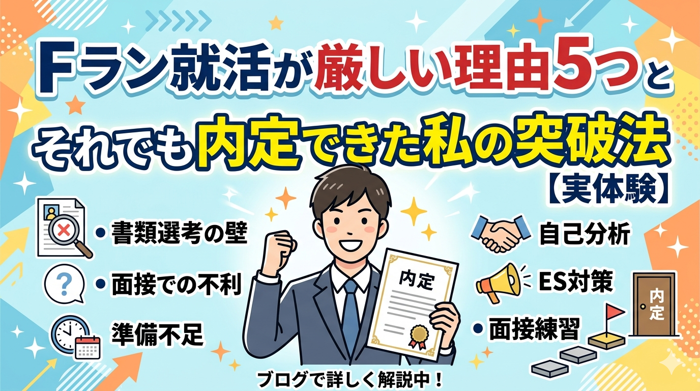 だからこの記事では、Fラン就活の厳しさを包み隠さず書きます。その上で、それでも私が内定を取れた理由と具体的な方法を話します。